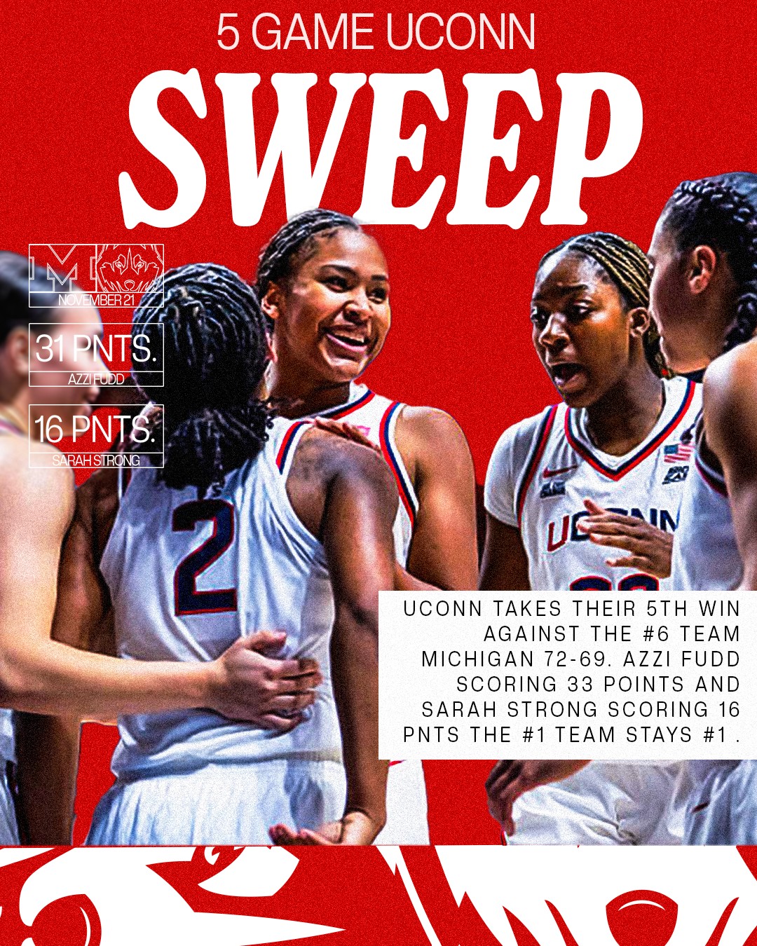For the UConn 2026 Women’s Basketball season, I created a series of game-day graphics, player highlights, and post-game recaps. This identity leans into UConn’s iconic red and white palette, pairing strong serif type with energetic player cutouts to capture the intensity and legacy of the program.